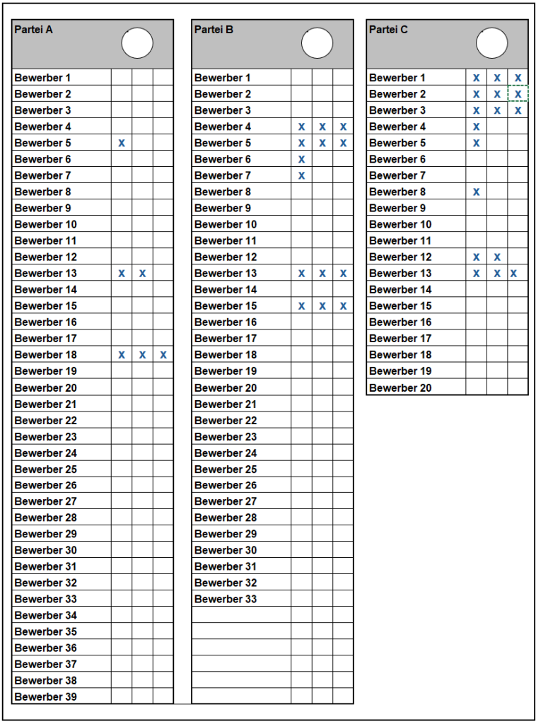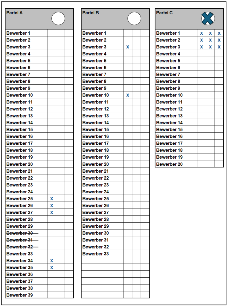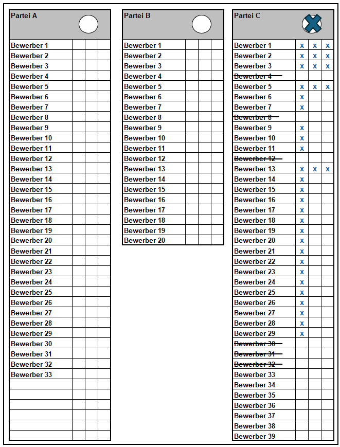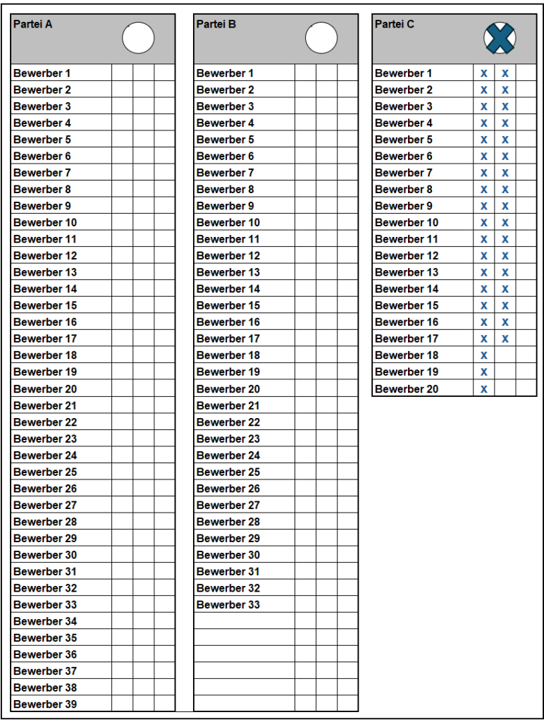 Somit können einzelnen Bewerbern bis zu 3 Stimmen zugeordnet werden. Gestrichene Bewerber erhalten auch über das Listenkreuz keine Stimme.